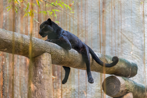 Black Panther Stands On A Wood On A Black Background