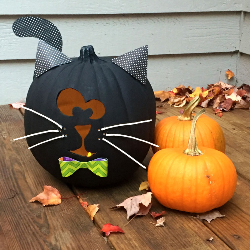 Black cat painted pumpkin. Cut out top of small pumpkin and scoop the inside clean. Do an internet image search for a simple cat face. Set head on the base to decide placement of eyes then carve them out. This kitty pumpkin stands on his own and would look super cute on a porch patio or.