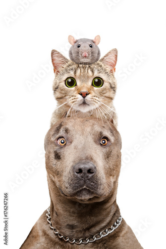 Funny Portrait Of A Pit Bull Dog Cat And Rat Closeup Isolated