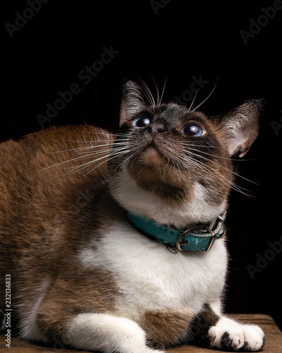 White With Brown Fluffy Cat On Blue Background Stock Photo