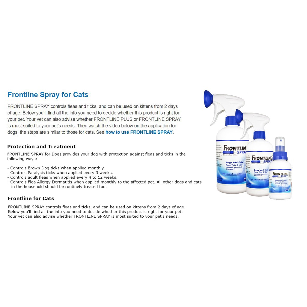 These days frontline is usually used as frontline spot on but there are occasions when applying as a spray is more suitable. Description frontline spray is the original form of the popular flea treatment. Indicated for the treatment and prevention of flea and tick infestations in cats and dogs and as part of a treatment strategy for flea allergy dermatitis in cats and dogs. Further information available in the spcs or from boehringer ingelheim animal health uk ltd rg12 8ys uk.