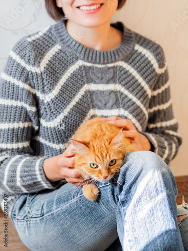 Cute Ginger Cat Dozing On Woman Knees Woman In Torn Jeans