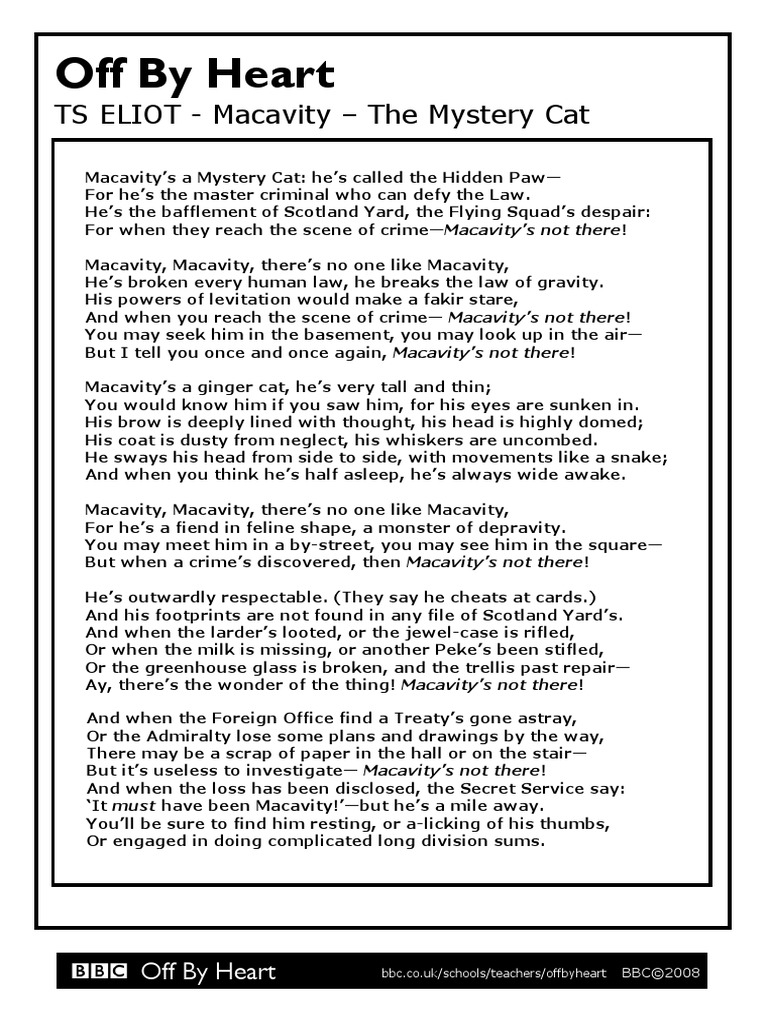 Macavity The Mystery Cat Poem By T S Eliot Reading Comprehension
