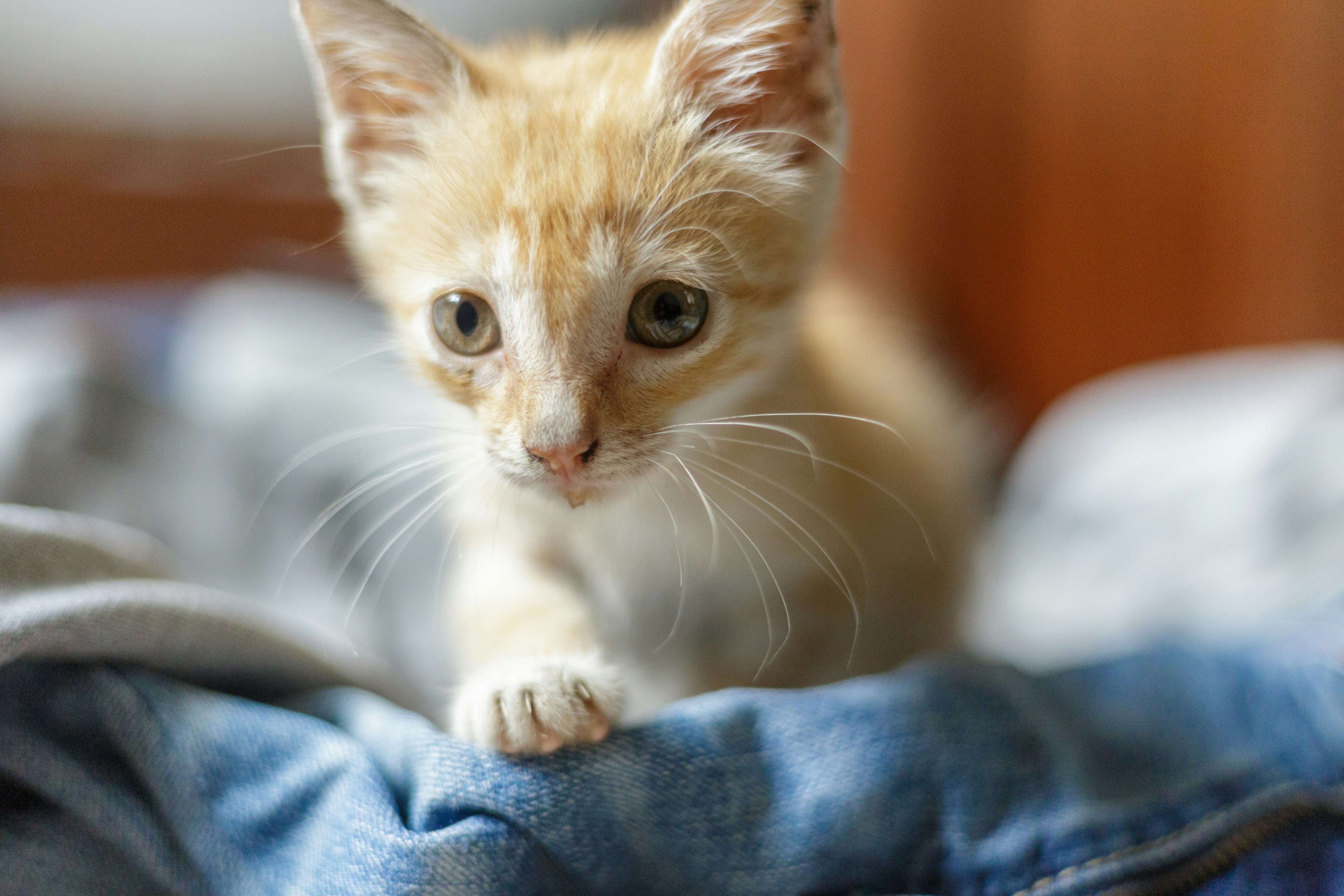 White And Orange Cat With Blue Eyes Looking At Camera Premium Photo