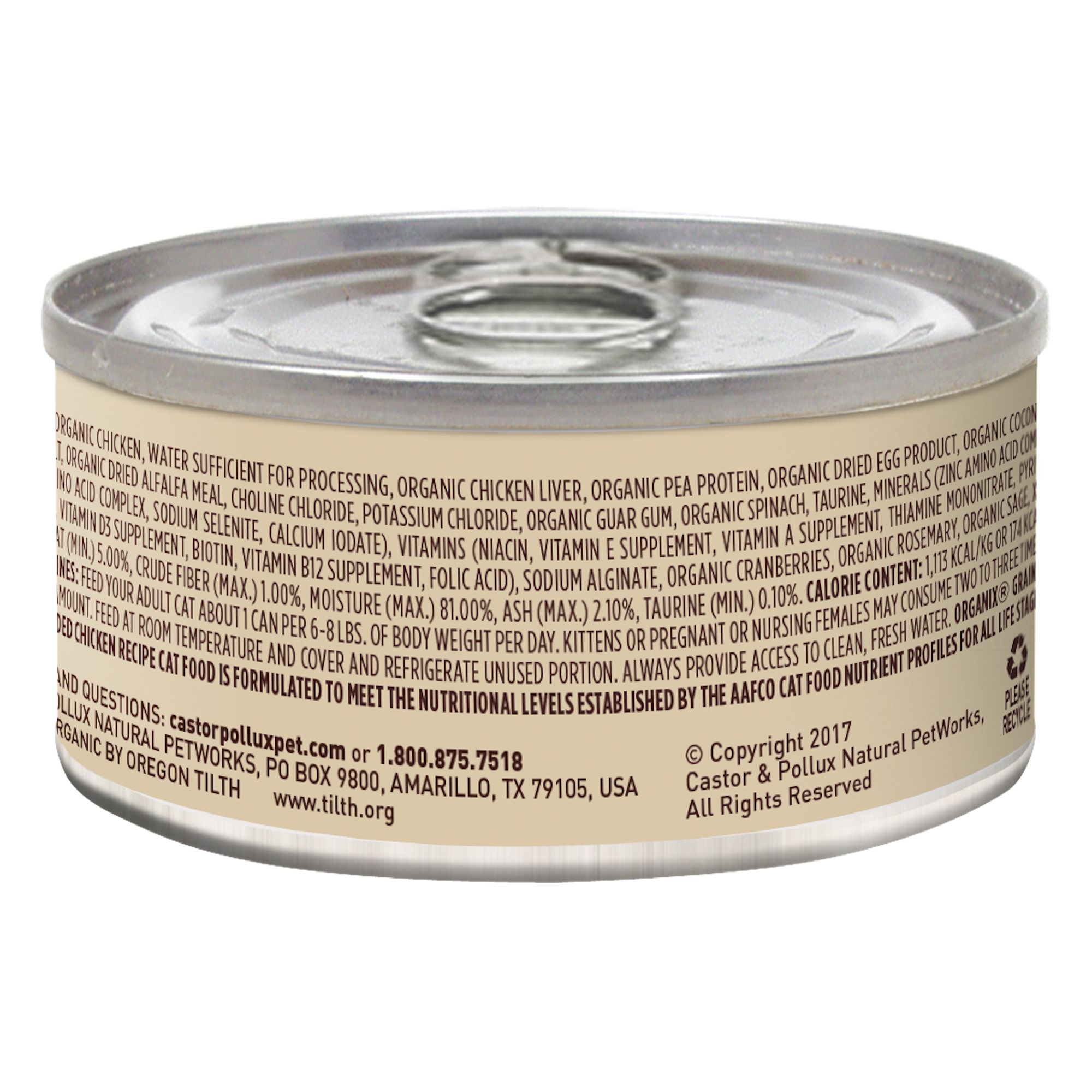Castor pollux organix grain free organic shredded chicken recipe is formulated to meet the nutritional levels established by the aafco cat food nutrient profilesfor all life stages.