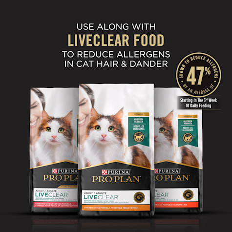 Pro plan liveclear is formulated to be fed to your cat every day for optimal benefit. Purina pro plan liveclear allergen reducing chicken rice formula dry cat food rating48 out of 5 stars 485 significantly reduces allergens in cat hair and dander. The diet will help a lot of people but not everyone. Bag purina pro plan with probiotics high protein dry cat food liveclear chicken rice formula the first and only cat food with the power to reduce cat allergens significantly reduces allergens in cat hair and dander simply and safely neutralizes fel d1 a common allergen in cat saliva with a key protein from eggs.