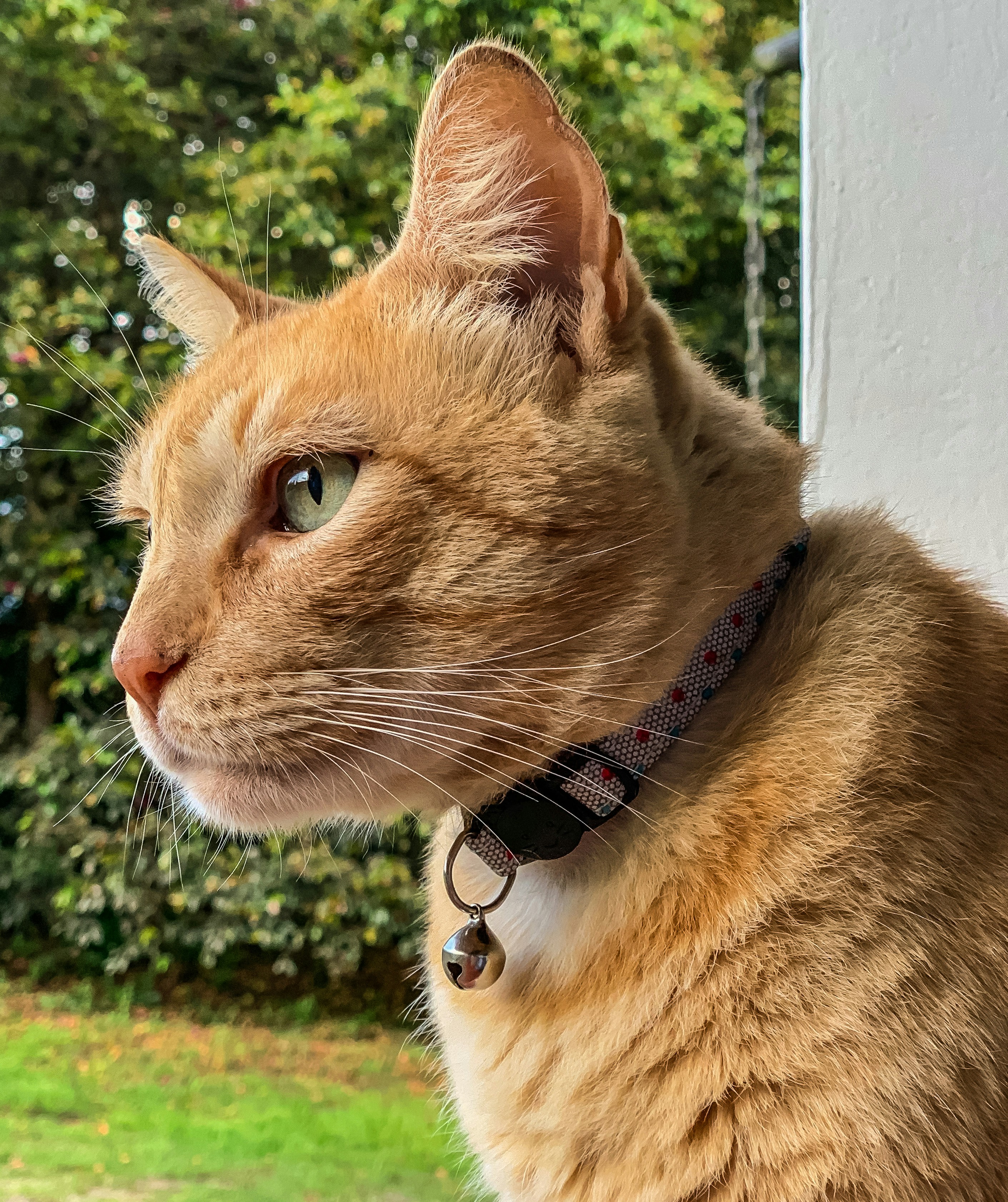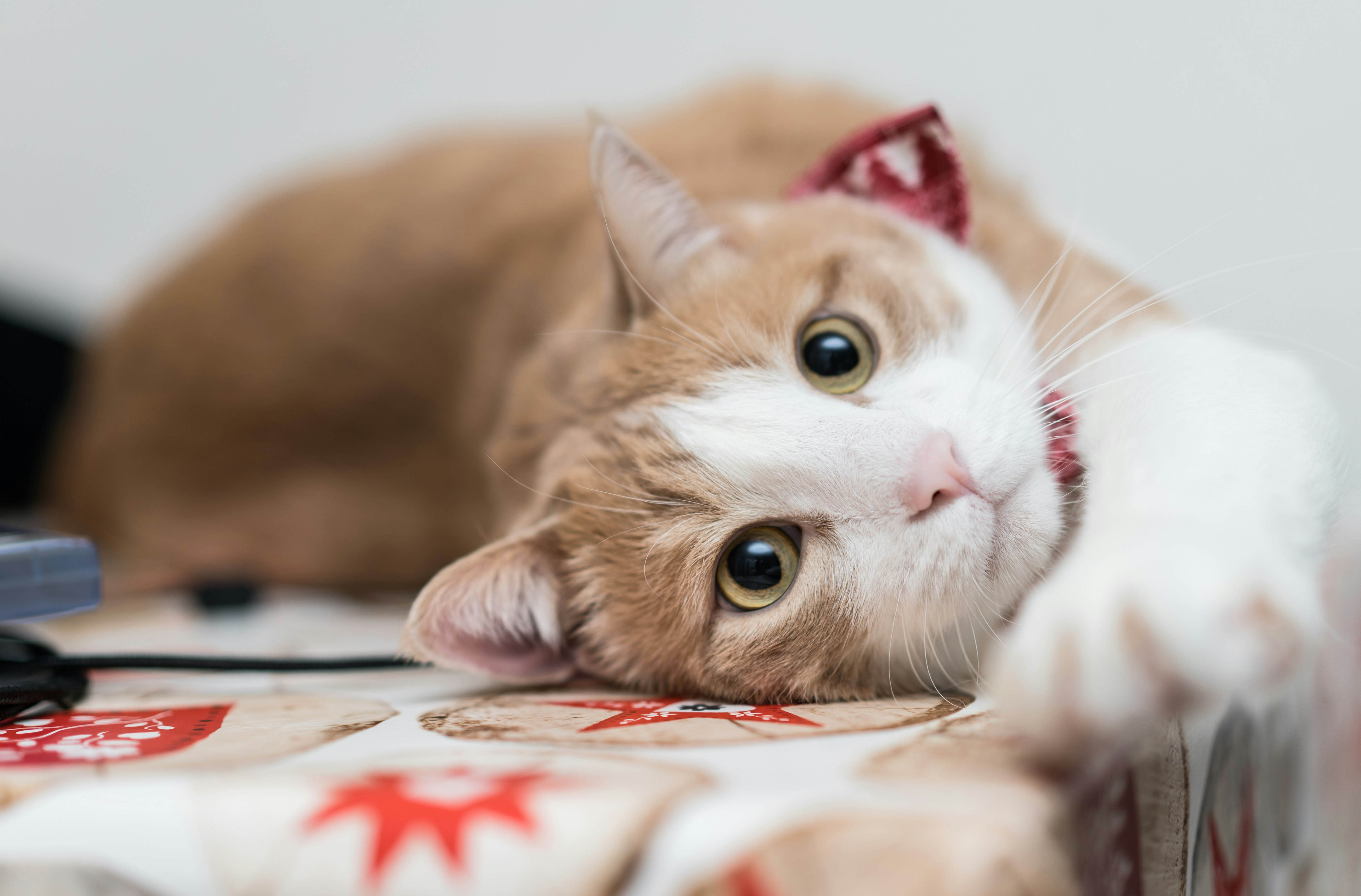 White Orange Tabby Cat Wearing Red Striped Bow Tie Lying Down