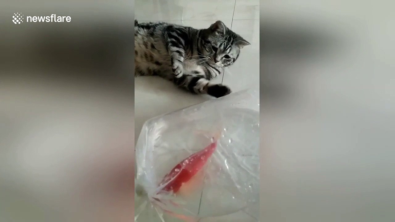 Fuzzy Ragdoll Breed Cat With Cute Face Watching Goldfish Swimming