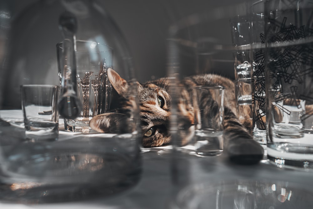 Brown Tabby Cat Drinking Water From Clear Drinking Glass Photo